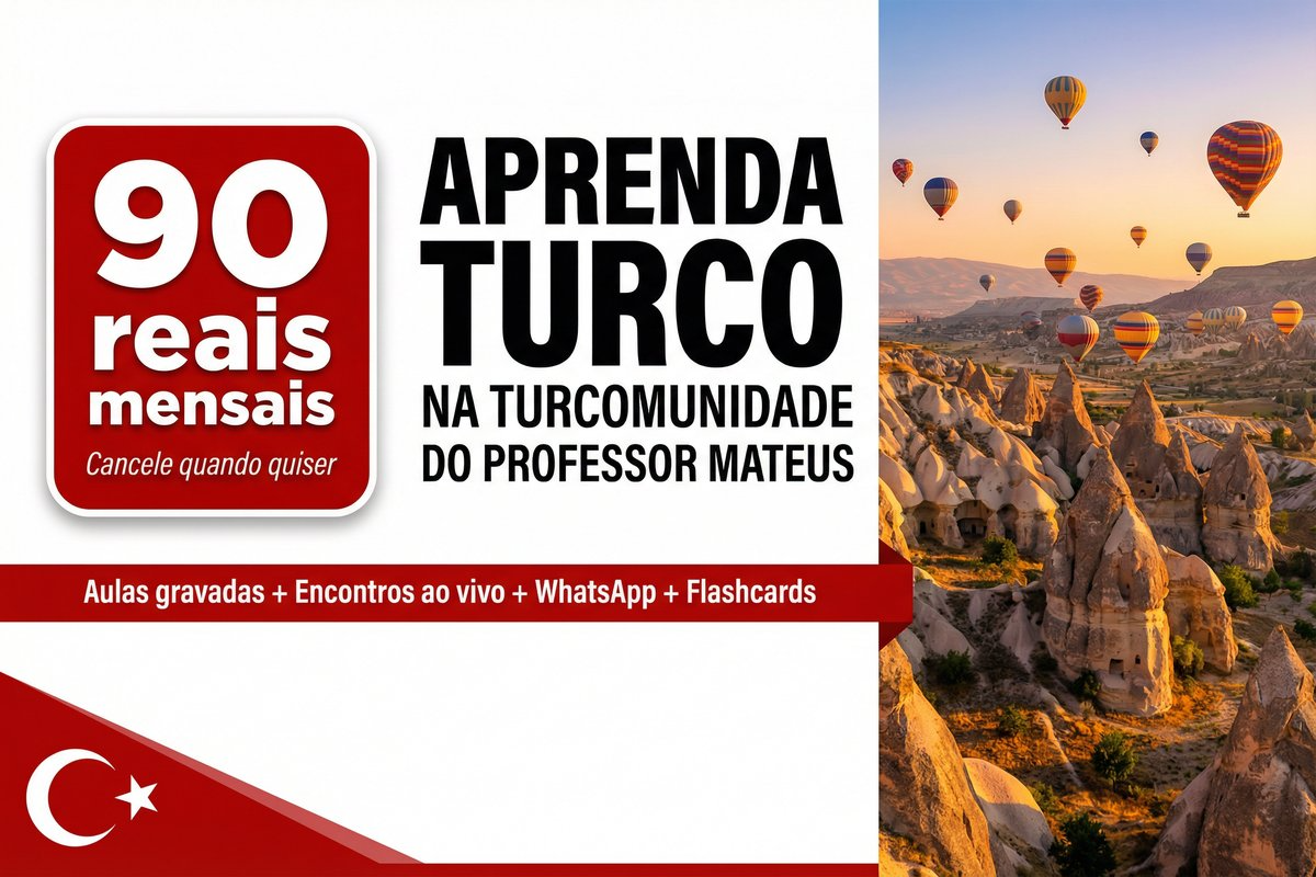 Entre para a comunidade e evolua no turco com aulas gravadas, encontros ao vivo mensais e conteúdo semanal no WhatsApp. Tudo isso por apenas R$ 90/mês, sem fidelidade — cancele quando quiser.