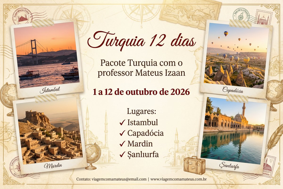 Turquia 2026 — 12 dias com o Professor Mateus Viaje para a Turquia de 1 a 12 de outubro de 2026. Um roteiro imersivo por Istambul, Capadócia, Mardin eŞanlıurfa guiado por quem ama e ensina a cultura turca.